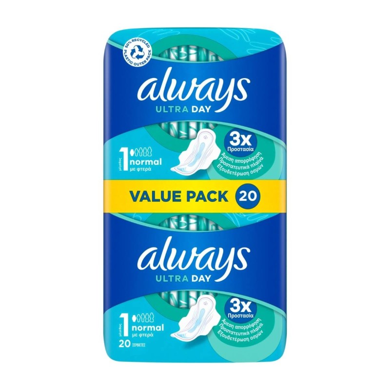 Το σύστημα InstantDry απορροφά τα υγρά σε δευτερόλεπτα και κρατά την υγρασία μακριά από την επιδερμίδα σας. Τεχνολογία LeakGuard που κλειδώνει τα υγρά και βοηθά στην πρόληψη των διαρροών. Είναι επίσης εξοπλισμένες με την τεχνολογία OdourLock που εξουδετερώνει τις οσμές, προσφέροντάς σας αίσθηση φρεσκάδας και καθαριότητας, σε όλη τη διάρκεια της περιόδου σας. Με την Always Ultra μπορείτε να αισθάνεστε αυτοπεποίθηση όλη την ημέρα.