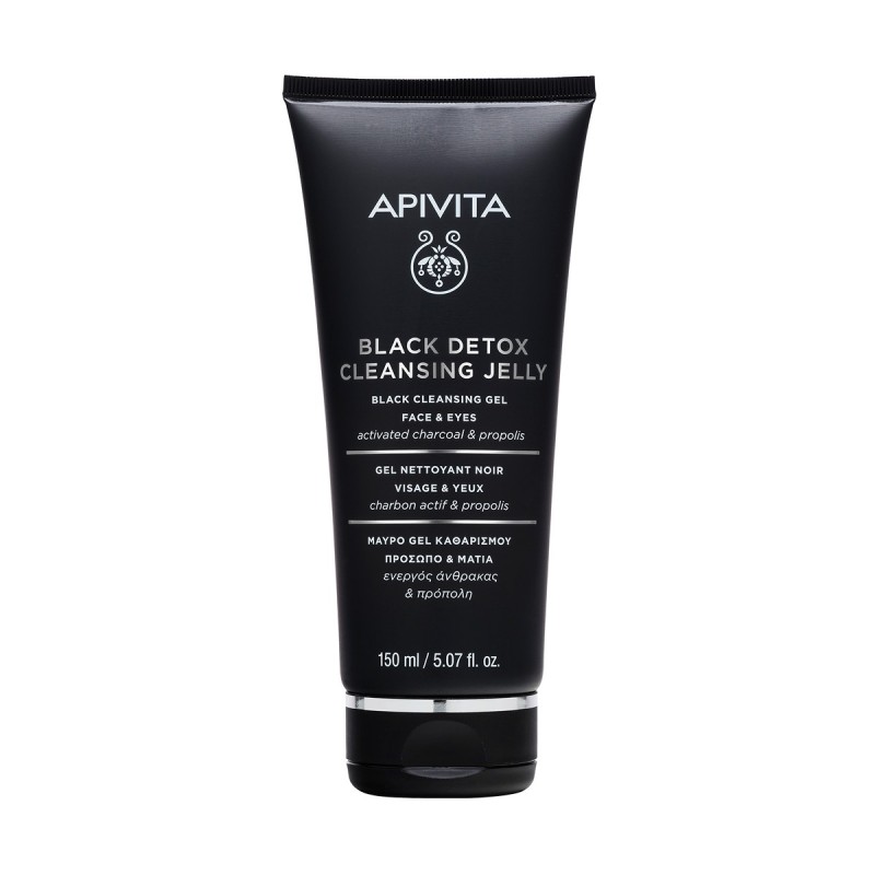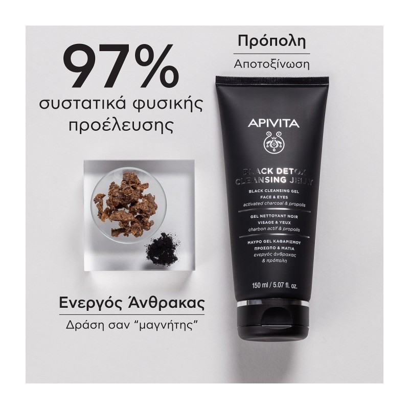 Μαύρο detox gel καθαρισμού με ενεργό άνθρακα και πρόπολη, που καθαρίζει αποτελεσματικά πρόσωπο και μάτια χωρίς να ερεθίζει.