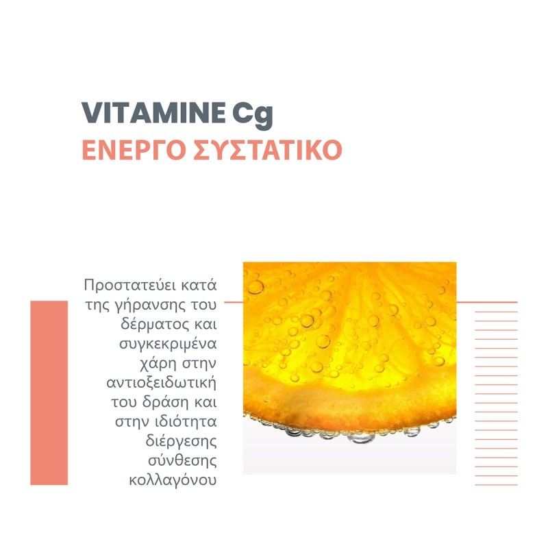 Η σύνθεσή της βασίζεται σε τρία δερματολογικά ενεργά συστατικά υψηλής αποτελεσματικότητας. Η Βιταμίνη Cg (1,8%), με αντιοξειδωτική δράση ισοδύναμη με 20% καθαρής βιταμίνης C, προσφέρει λάμψη και προστασία από τις ελεύθερες ρίζες. Η Νιασιναμίδη (6%) συμβάλλει στην αναζωογόνηση της επιδερμίδας και στη μείωση των δυσχρωμιών, ενώ το Υαλουρονικό Οξύ, φυσικής προέλευσης, προσφέρει εντατική ενυδάτωση, λειαίνει και γεμίζει το δέρμα, ενισχύοντας την ελαστικότητά του.