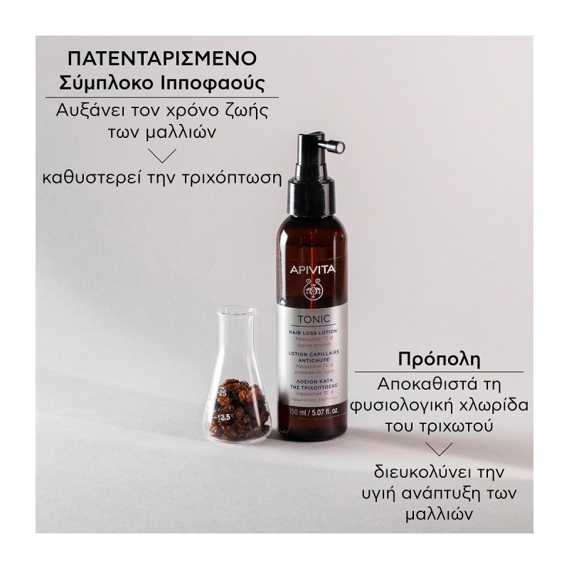 For best results, it is recommended to combine with other products in the Apivita Tonic series, which includes: Toning Shampoos for women and men, Conditioner, Lotion and Capsules (dietary supplement). Follow the treatment for at least 3 months and repeat the same treatment 2-3 times a year.