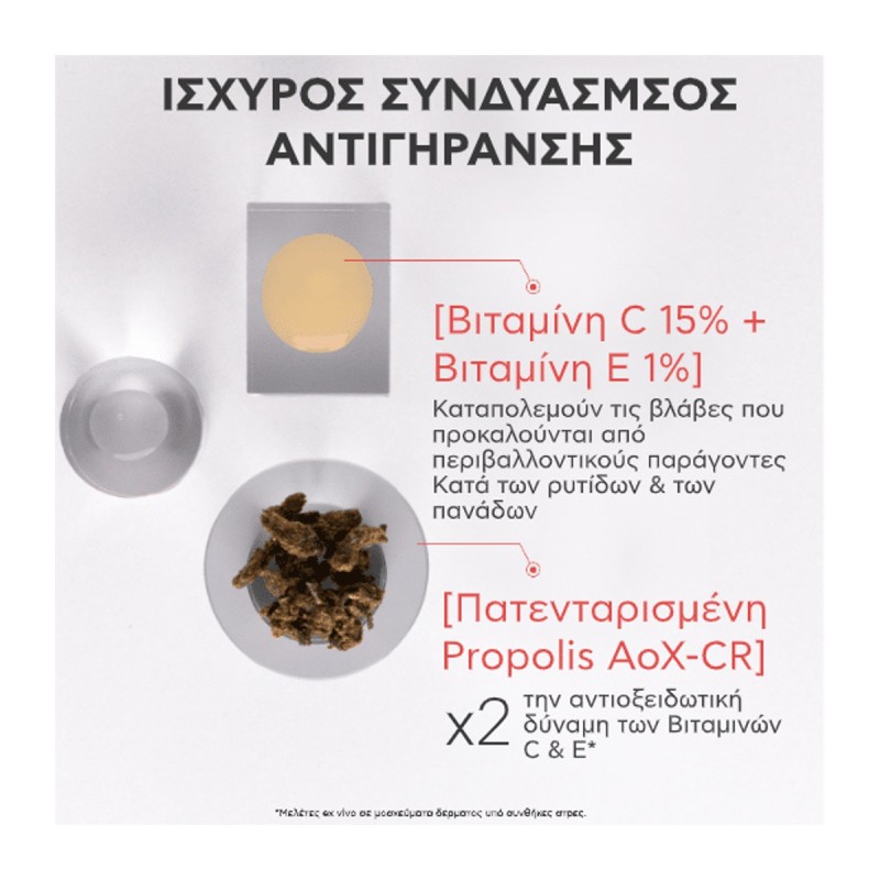 The powerful antioxidant action of these two leading dermatological actives is enhanced by APIVITAs exclusive patent, Propolis AoX-CR. Its incomparable effectiveness has been proven to DOUBLE the antioxidant power of vitamins C + E1, significantly enhancing the anti-aging effects of this powerful synergistic combination.