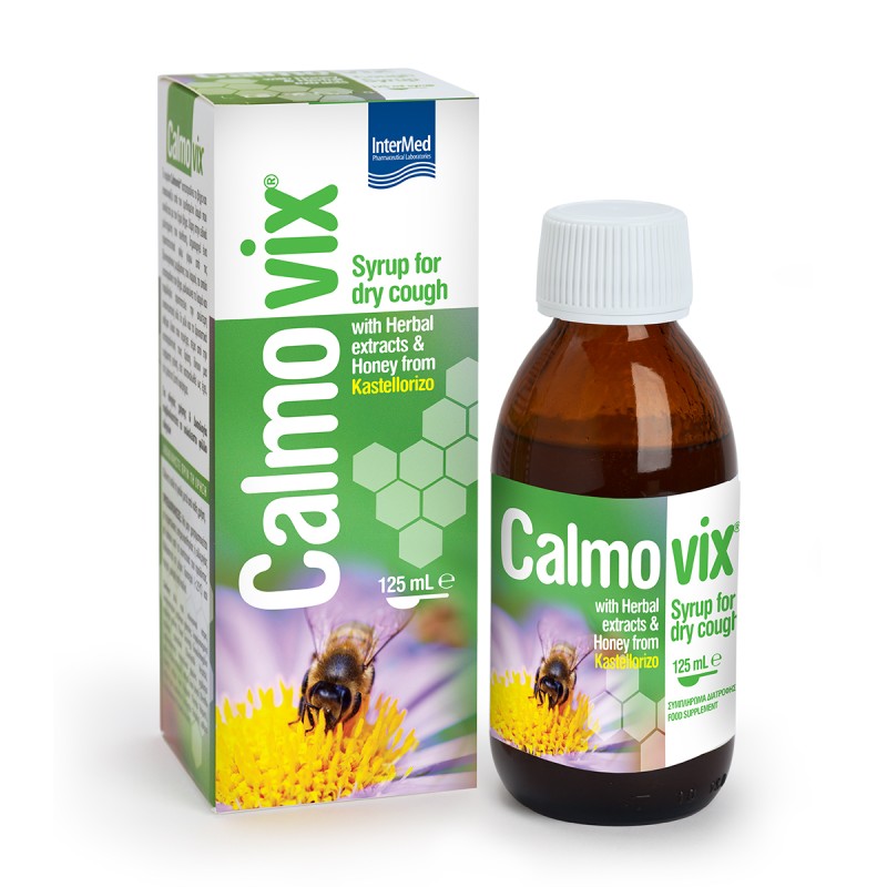 Intermed Calmovix is a syrup formulated to soothe dry cough and relieve throat irritation. Its special formula creates a protective film over the mucous membranes, which softens the throat, calms the cough, and protects the upper respiratory tract. It contains natural active ingredients: honey and marshmallow (althea) extract to soothe and protect, anise essential oil to address irritation and hoarseness, and peppermint oil to cool and comfort the throat.