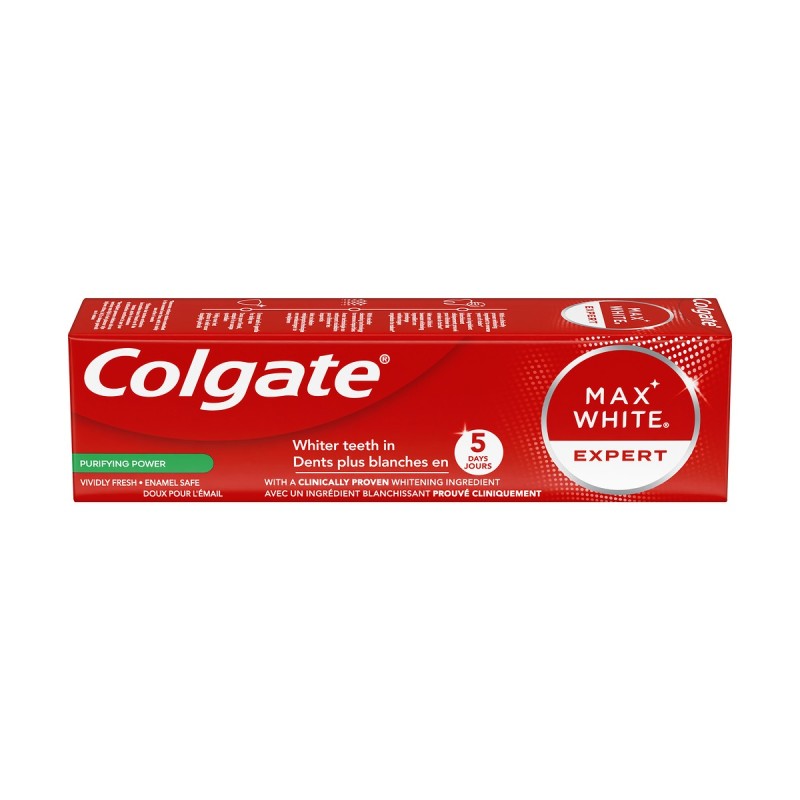 Colgate Max White Expert Purifying Power Toothpaste helps reverse stubborn surface stains for a visibly whiter smile. Thanks to advanced micellar technology, it provides a deep yet gentle clean that is enamel-friendly, delivering professional-level whitening without compromise.