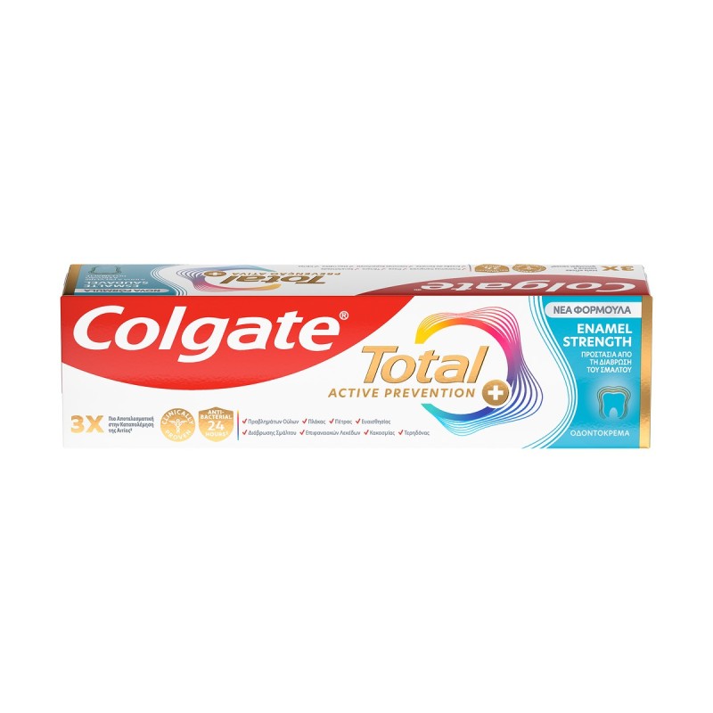 Colgate Total Active Prevention + Enamel Strength Toothpaste is clinically proven and actively helps prevent multiple oral health problems with 24-hour antibacterial protection*. *With twice-daily brushing after 4 weeks of use.