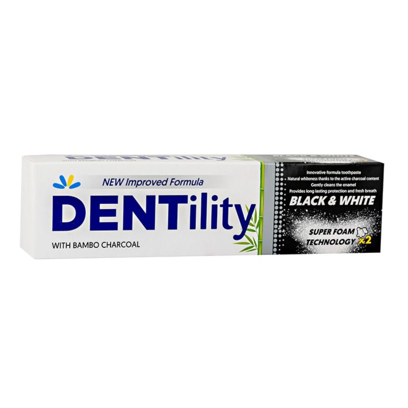 The innovative formula of Dentility Black & White toothpaste contains activated carbon, which absorbs toxins from the oral cavity and removes stains without wearing down tooth enamel, while providing fresh breath.