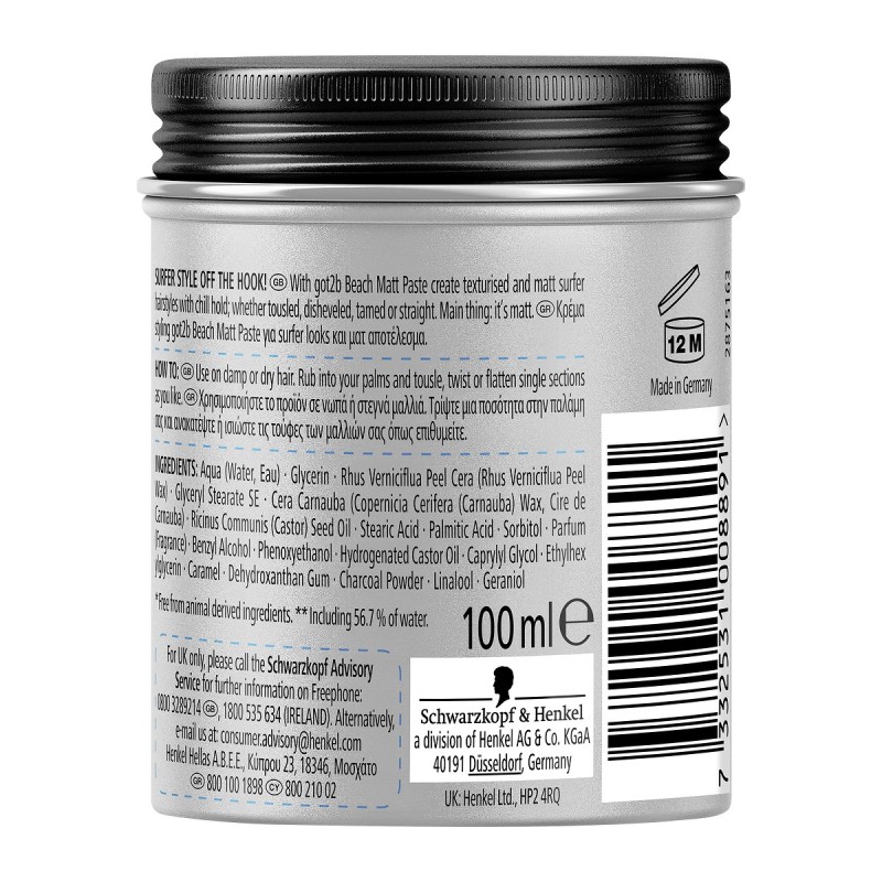 got2b Beach Matt Paste styling cream for surfer looks and a matte finish. Give texture and a matte finish to your looks whether you want hold or a messy look. The given is one: a matte finish. The vegan* formula contains 97% ingredients of natural origin** and the packaging is recyclable***.