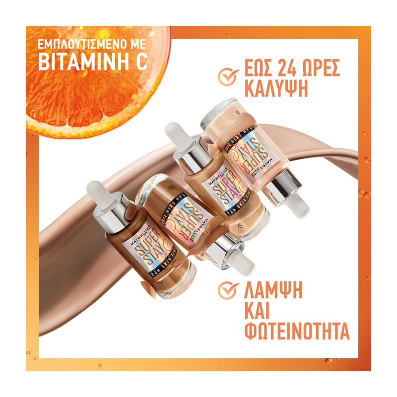 Introducing the non-stop super drop, Super Stay up to 24H Skin Tint Foundation! Vitamin C* infused vegan formula*** brightens and delivers beautiful skin-like coverage that lasts all day. 95 % said skin looks healthy**. Weightless feel. Resists sweat, humidity and fading. Suitable for all skin types, even sensitive skin. *Vitamin C derivative **In a consumer test. After 4 weeks of daily use. *** Vegan formula: No animal derived ingredients or by-products