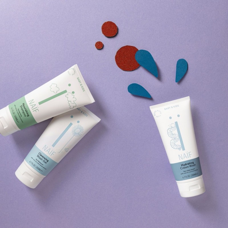 Naif Shampoo does not contain microplastics, silicones and SLES and is therefore mild for the eyes. Instead, we use Sodium Coco-Sulfate for a foaming effect. This is a derivative of coconut fibre and therefore made with natural ingredients. We added cottonseed oil to help moisturise the (sensitive) baby skin.