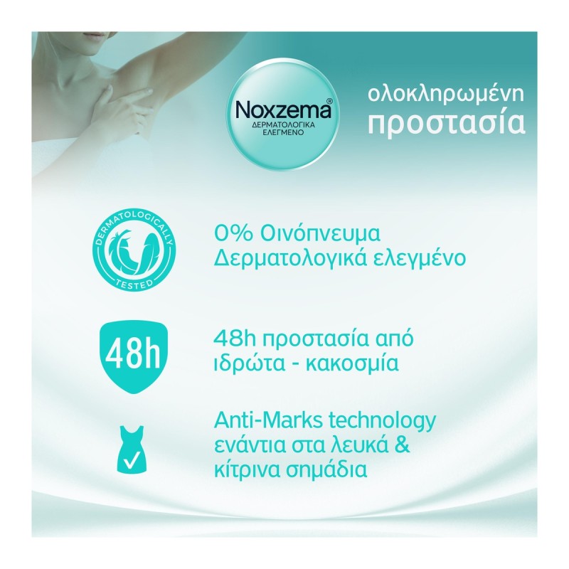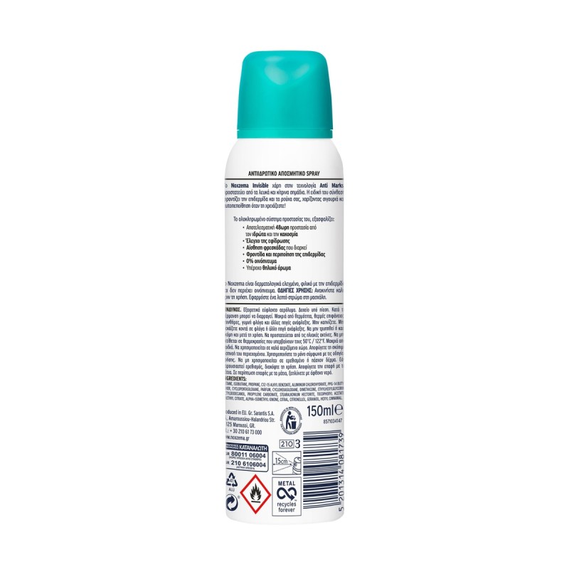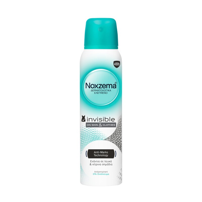 Noxzema Invisible women’s antiperspirant deodorant spray, thanks to Anti-Marks technology, protects clothes from white and yellow stains. Its special formula cares for both skin and clothes, releases a long-lasting fresh scent, and provides 48-hour protection against sweat and odor. Dermatologically tested, skin-friendly, with an anti-white marks formula, a delightful feminine fragrance, and alcohol-free. Apply a thin layer to the underarm area.