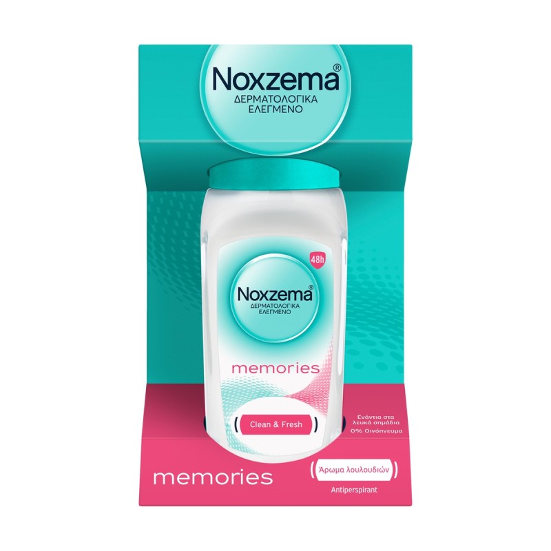 Noxzema Memories women’s roll-on antiperspirant deodorant, with clinically proven gentleness and Clean & Fresh technology, releases a floral scent and a long-lasting feeling of freshness, while providing effective 48-hour protection against sweat and odor. It is dermatologically tested, skin-friendly, formulated to prevent white marks, has a soft feminine fragrance, and is alcohol-free. Apply a thin layer to the underarm area.