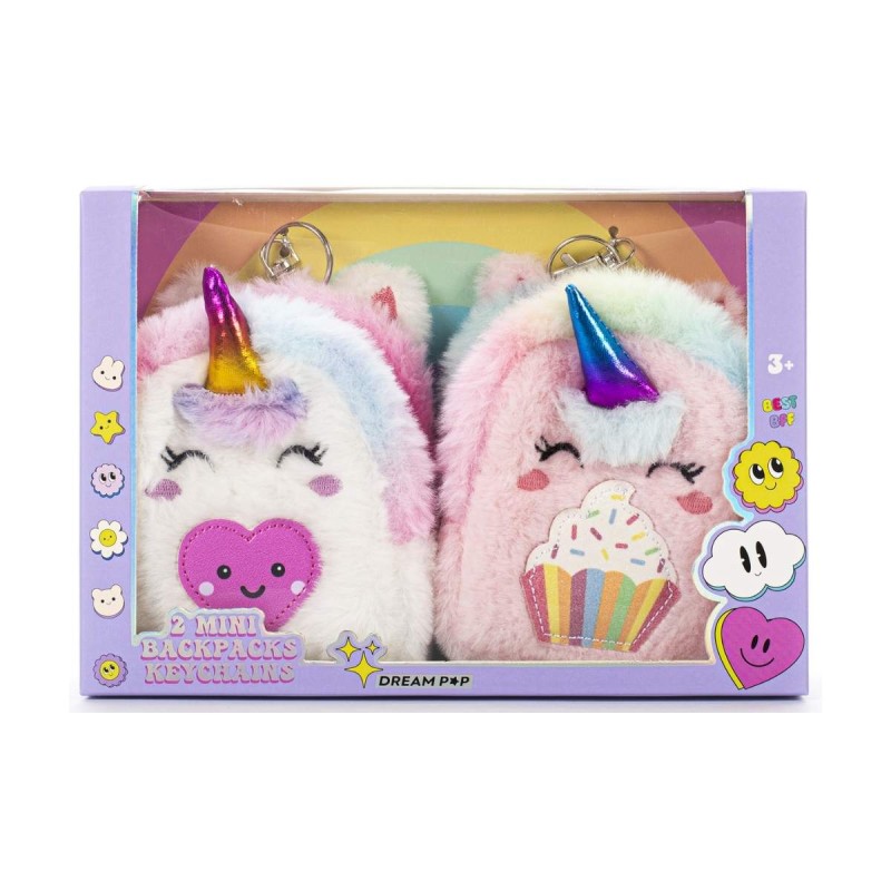 Double the charm with the Dream Pop Mini Backpack Keychain Set! This 2-pack features two fluffy mini backpacks designed as adorable unicorn cats, each with embroidered sleepy eyes, pastel rainbow horns, and sweet applique details like hearts and cupcakes.