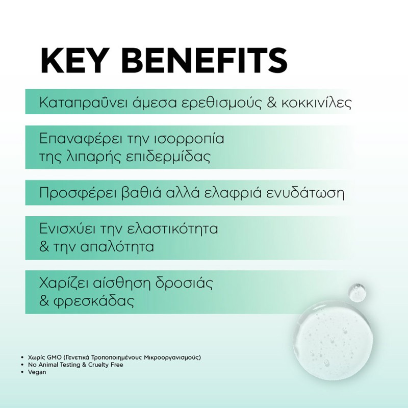 Its effective formula works to restore the skin after irritations and inflammation, offering deep hydration, improved texture, and enhanced elasticity.