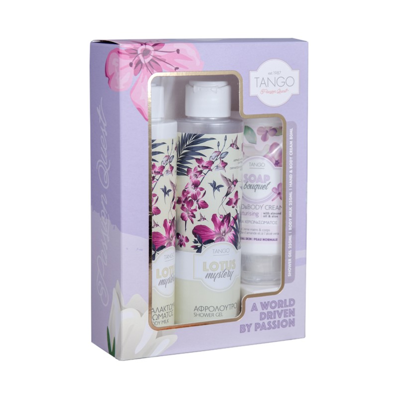 Discover the Tango Gift Sets, perfect for complete body care. Each set includes a shower gel, body lotion, and hand cream, offering deep hydration and nourishment. With unique fragrances, they deliver a daily sense of freshness and luxury. Ideal as a gift or for personal pampering, they combine quality and care in a complete set. Elevate your beauty routine with the Tango Gift Sets.