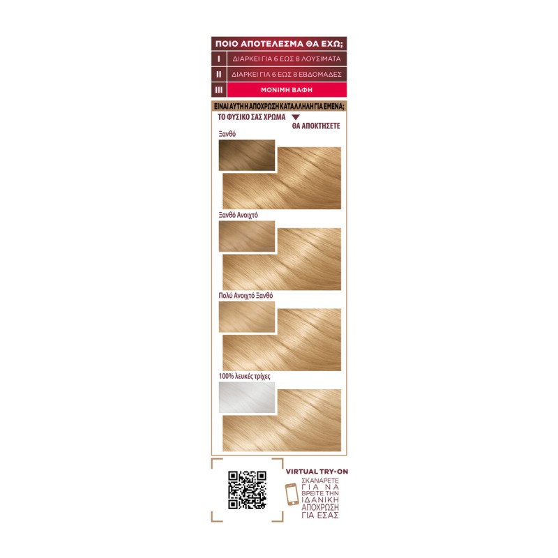 Σε περίπτωση οποιασδήποτε αντίδρασης ή σε περίπτωση αμφιβολίας, συμβουλευτείτε ένα γιατρό πριν χρησιμοποιήσετε οποιοδήποτε προϊόν βαφής μαλλιών.