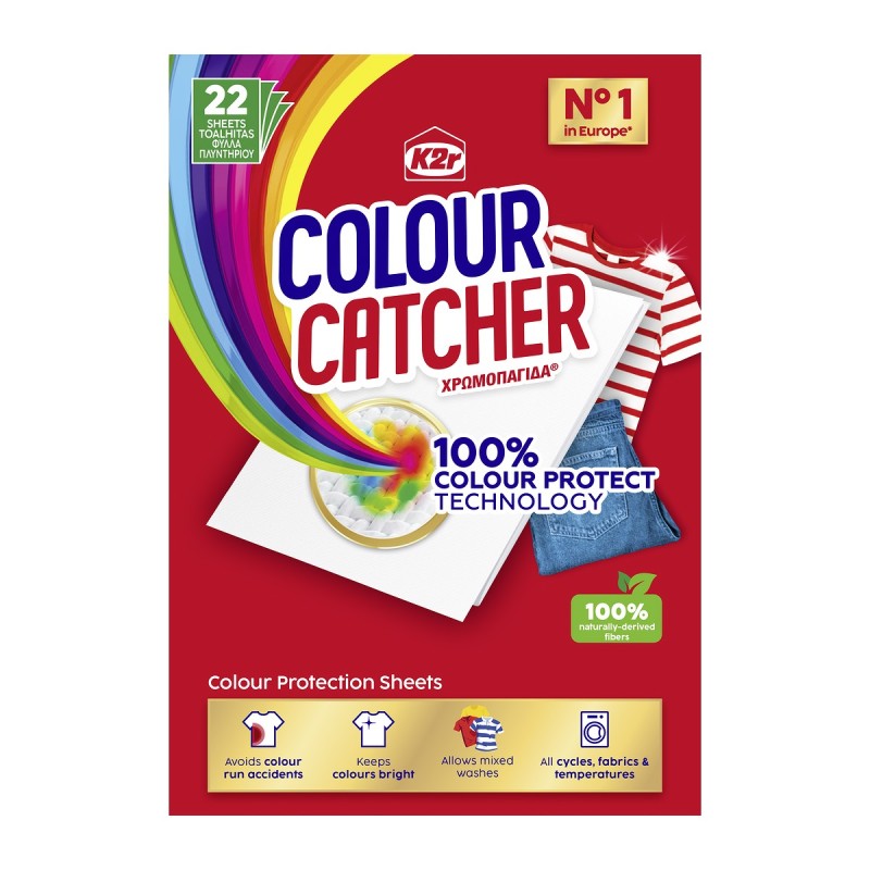 Οι χρωμοπαγίδες της εταιρείας K2R προστατεύουν τα χρώματα των ρούχων, προλαμβάνοντας τη μεταφορά των χρωμάτων κατά τη διάρκεια μεικτών πλύσεων. Αποτρέπουν το γάριασμα, απορροφούν και εγκλωβίζουν τη βαφή και τα κατάλοιπα βρωμιάς. Μακριά από παιδιά