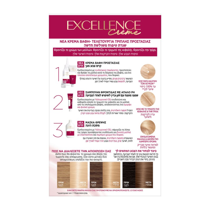 H Excellence εξελίσσεται με μία νέα, βελτιωμένη σύνθεση, εμπλουτισμένη με Υαλουρονικό οξύ. Τριπλή ρουτίνα προστασίας που δεν στάζει για ακόμα πιο πλούσιο χρώμα και 10Χ περισσότερη ενυδάτωση. Φόρμουλα εμπλουτισμένη με Προκερατίνη, αναδομεί και αναζωογονεί τα μαλλιά και τα θρέφει, αφήνοντάς τα μεταξένια και απαλά. Χαρίζει εντυπωσιακό χρώμα, χωρίς ούτε μια λευκή τρίχα!