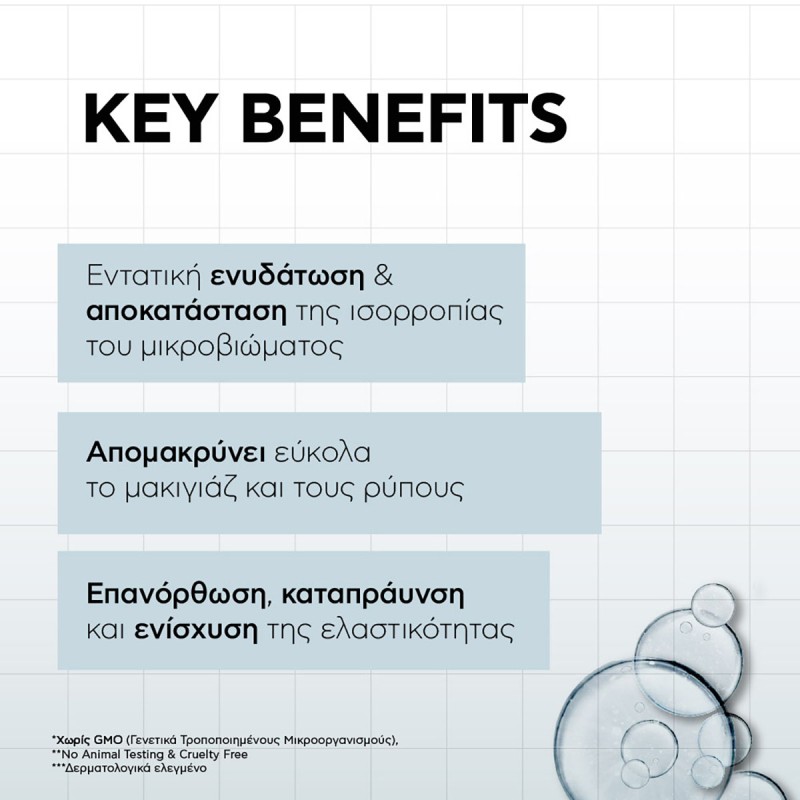 Εμπλουτισμένο με 3x Υαλουρονικό Οξύ, το προϊόν δρα σε πολλαπλά επίπεδα, συγκρατώντας την υγρασία, αποτρέποντας την εμφάνιση λεπτών γραμμών και χαρίζοντας δέρμα λείο, απαλό και ελαστικό. Επιπλέον, το Panthenol 1% συμβάλλει στην επανόρθωση της επιδερμίδας, καταπραΰνει τους ερεθισμούς και ενισχύει την υγιή και ισορροπημένη όψη του δέρματος.